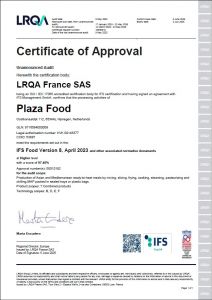 | Products of the highest quality are of the utmost importance to our company. Tastes are monitored constantly and improved where possible. If there is a possibility to optimalise raw materials and/ or our way of producing, we’ll immediately take the necessary steps. No matter what we do, we always take our responsibility regarding humanity, animals and the environment. Plaza Foods meets the highest IFS classification and is a participant of IFS Food Check for unannounced audits. IFS has their own certification programs with their own focus points. Accredited organizations annually test to what extent producers (still) meet the set requirements. What certification prevails in a collaboration depends, among other things, on the country of origin of a partner organization. For more information, see www.ifs-certification.com |